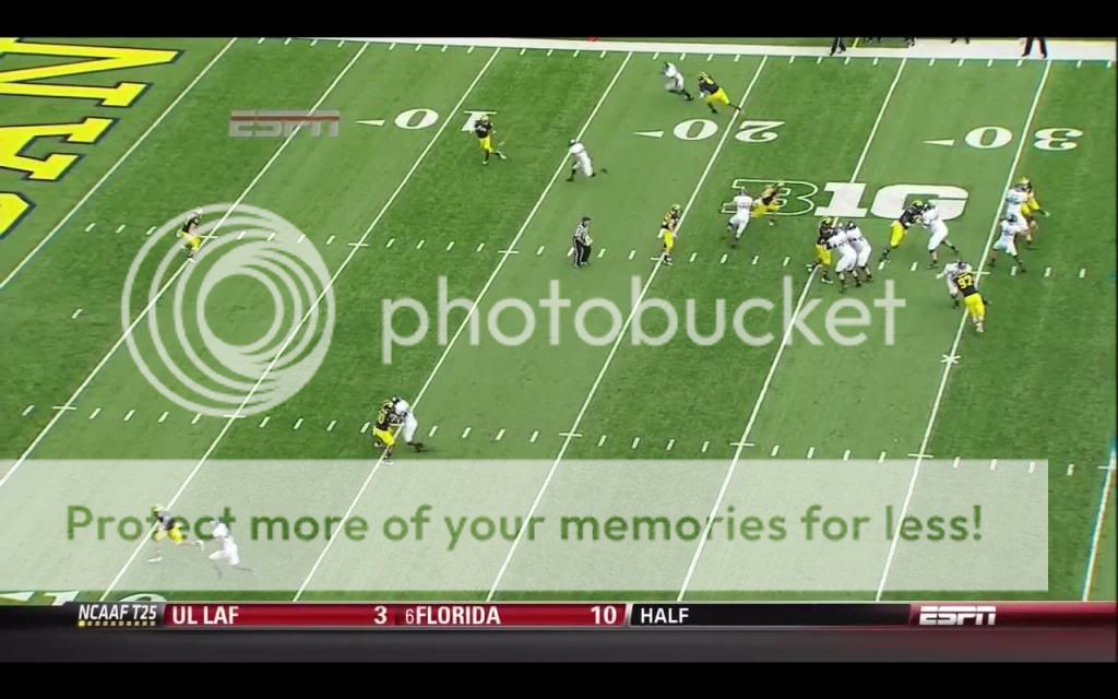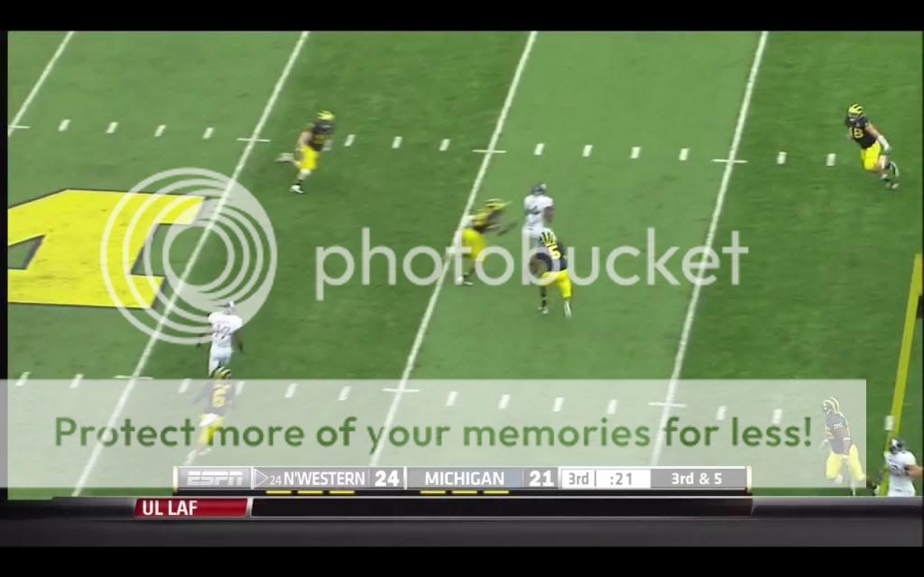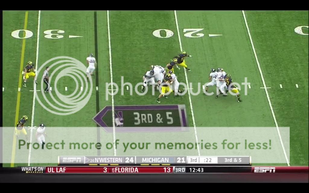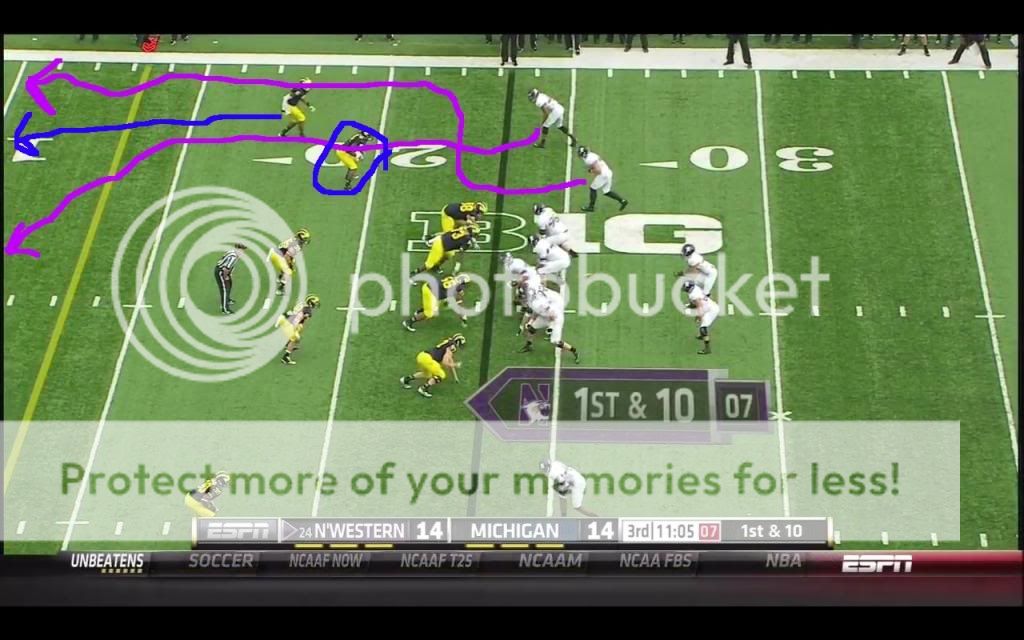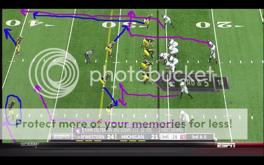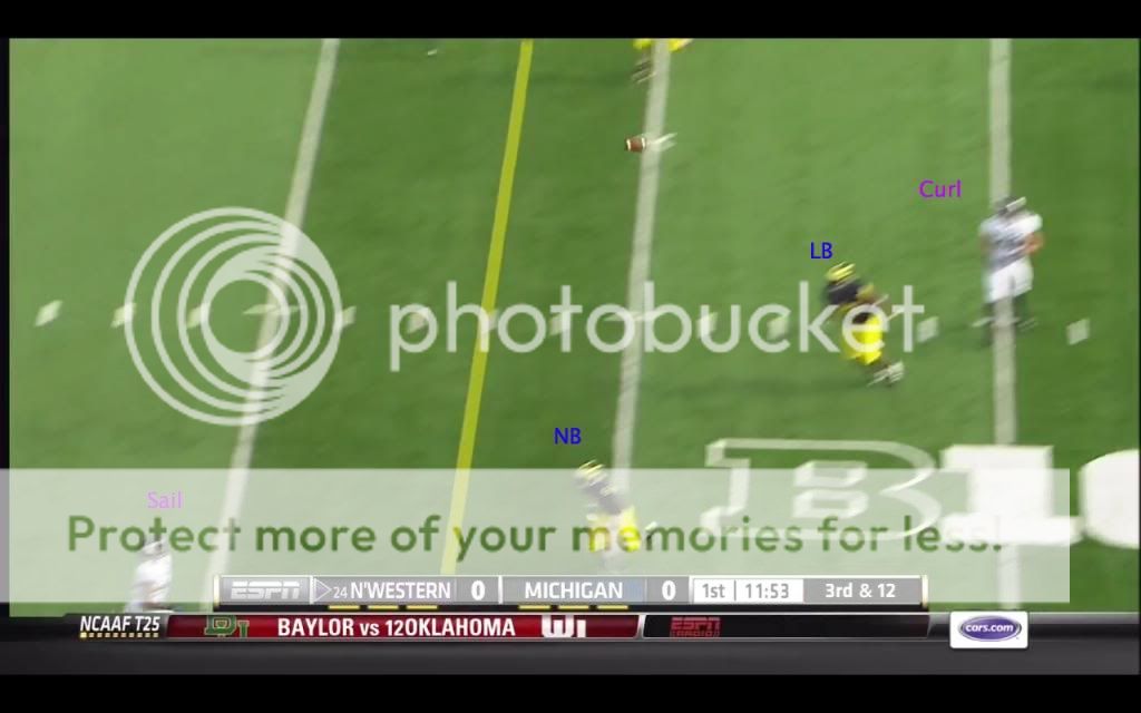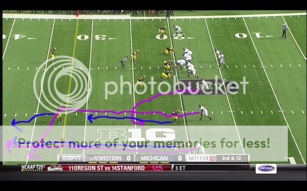 Like we probably will, Michigan ran a lot of split safety zone coverages in their game against the Wildcats, so I'll only talk about that game (MSU was the only other game I could get, and their DC pulled out a lot more stops in coverage). In that game, the most common individual passing concept that Northwestern used was the “flood” route. The basic premise of this kind of route is that most zone coverages have some number of defenders distributed evenly across the field playing deep zones, and some number of defenders spread evenly across the field playing underneath zones. The defense therefore has two levels: deep and underneath. If you run routes that attack three different levels, the defense should should have trouble accounting for them all. Because such routes require at least three receivers being in the same area, they are especially well-suited to Northwestern's favored 3x1 formation. One of their go-to pass plays on third down was the following: