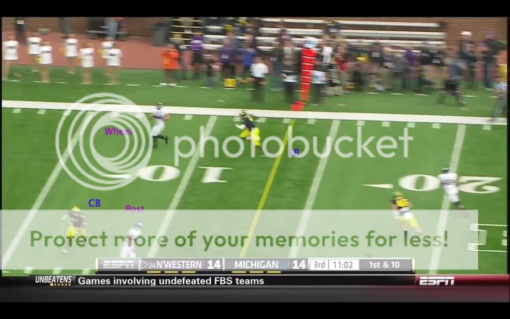 In other posts I've mentioned that Cover-3 is a coverage teams will go to to tighten up run defense. When teams do that, Northwestern likes to run a post-wheel concept, which seeks to isolate a deep defender instead of an underneath one. They ran this a bunch in both of the games that I watched: