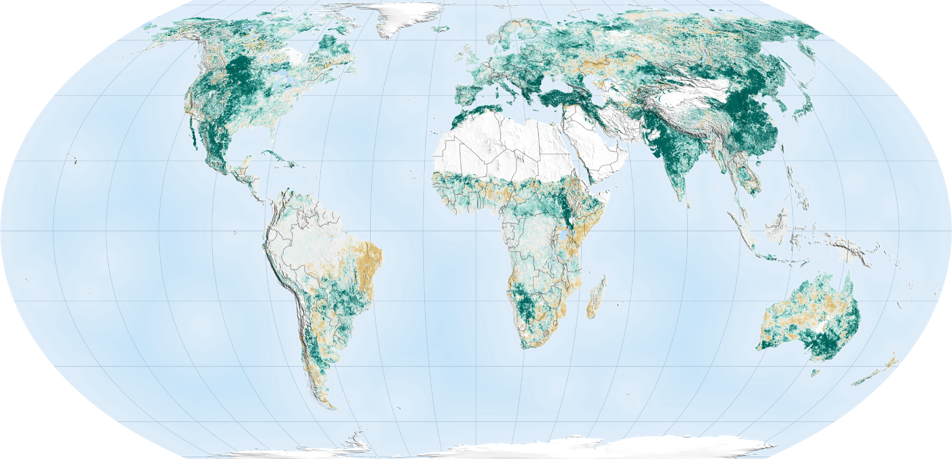 Green areas saw a growth in foliage from 2000 to 2017, while brown areas saw a drop. Joshua Stevens / NASA Earth Observatory