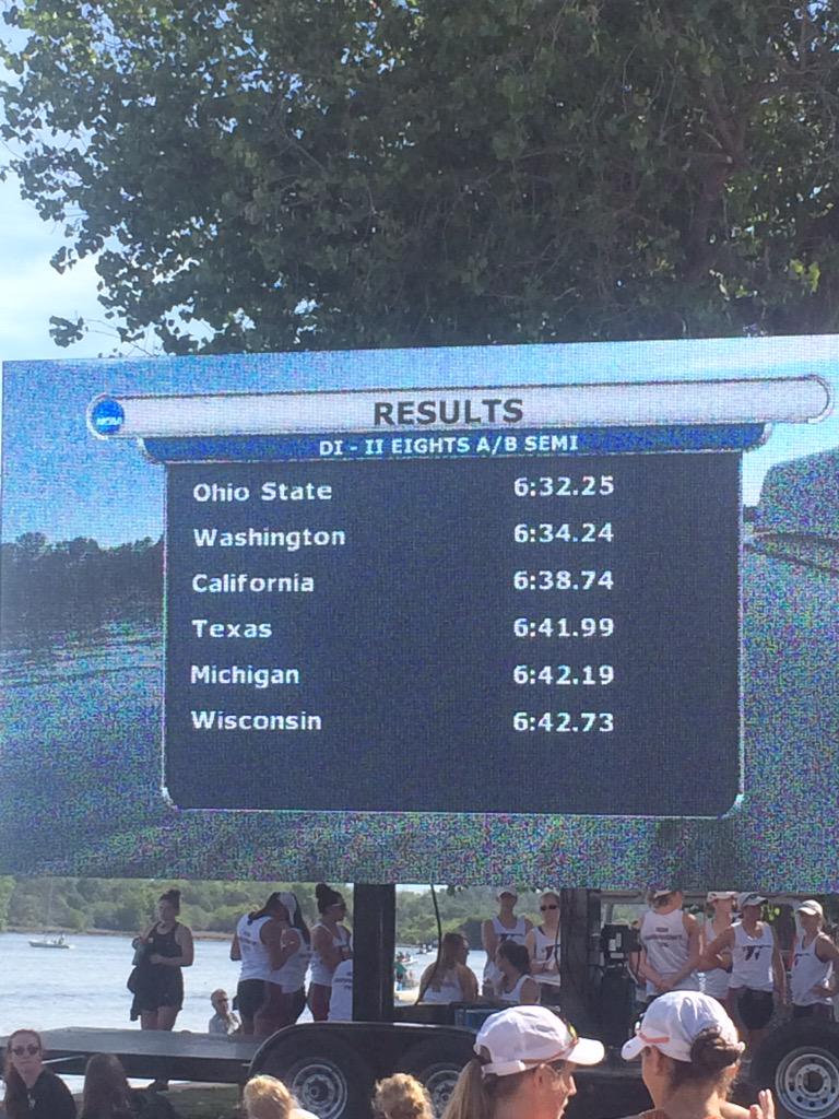 Results: 1. Ohio State (06:18.1), 2. California (06:18.6), 3. Virginia (06:24.3), 4. Texas (06:27.2), 5. Stanford (06:28), 6. Washington (06:28.5)