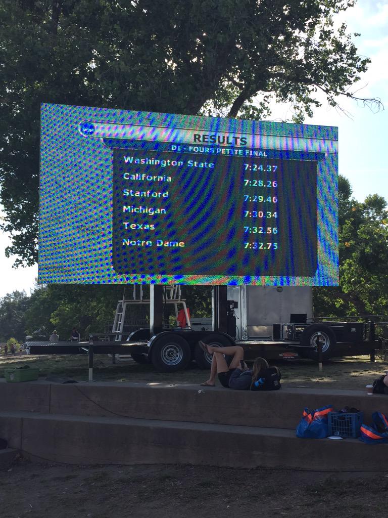 Results: 1. Washington State (07:24.4), 2. California (07:28.3), 3. Stanford (07:29.5), 4. Michigan (07:30.3), 5. Texas (07:32.6), 6. Notre Dame (07:32.7)