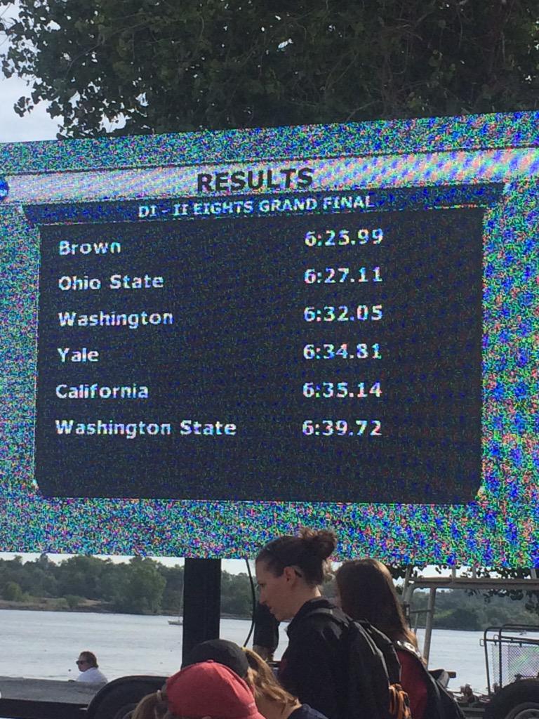 Results: 1. Brown (06:26), 2. Ohio State (06:27.1), 3. Washington (06:32.1), 4. Yale (06:34.8), 5. California (06:35.1), 6. Washington State (06:39.7)