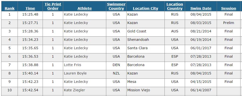 USA Swimming: All-Time Top 10 performances in the women's 1500 Free.