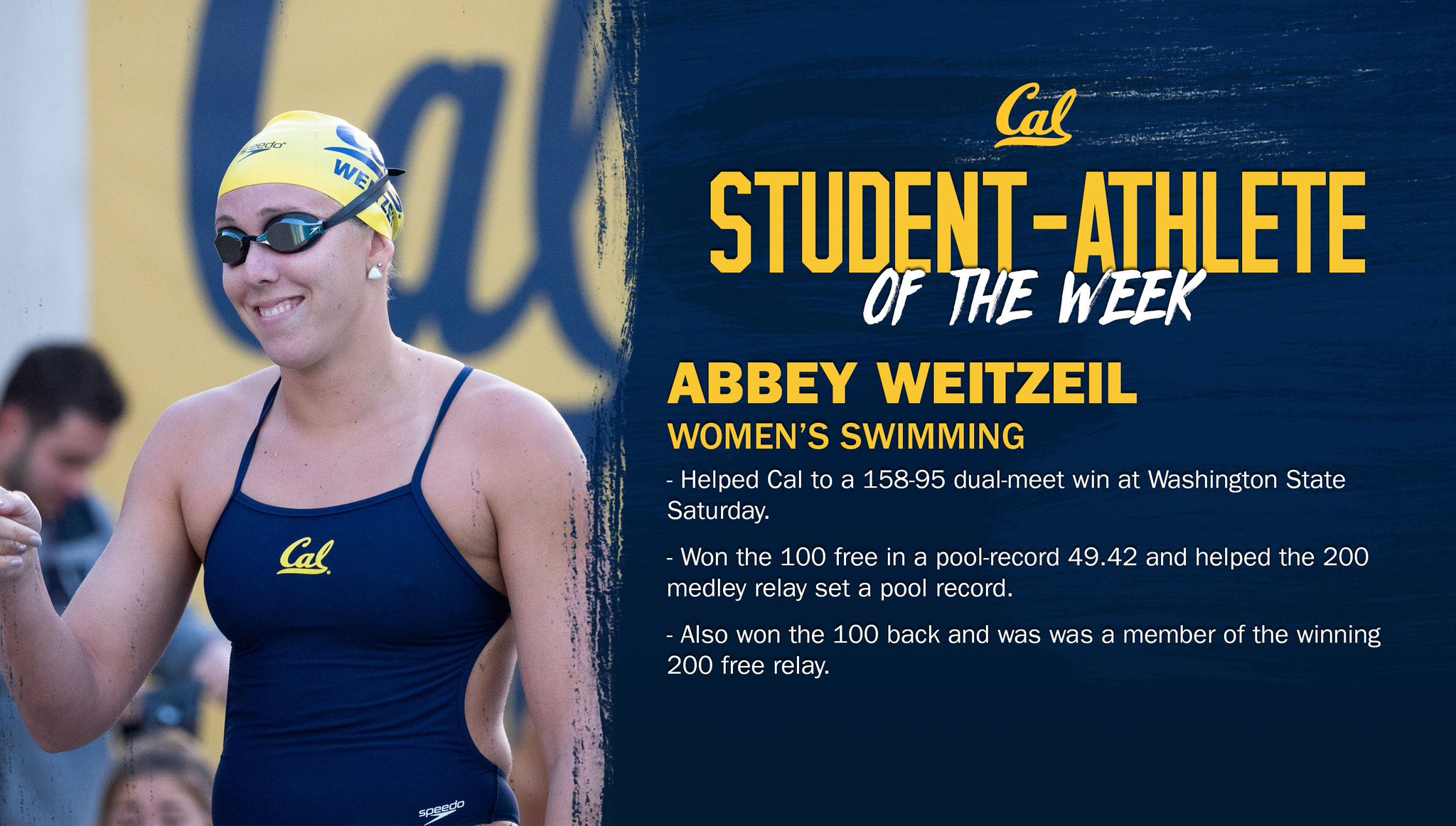 Weitzeil tied her own Cal dual-meet record with a victory in the 50-yard freestyle with a time of 22.04 and she came back a few moments later to claim the 100 free in 48.70. In addition, she anchored both the 200 medley relay and the 200 free relay to wins, including a 21.52 split to close out the medley relay.