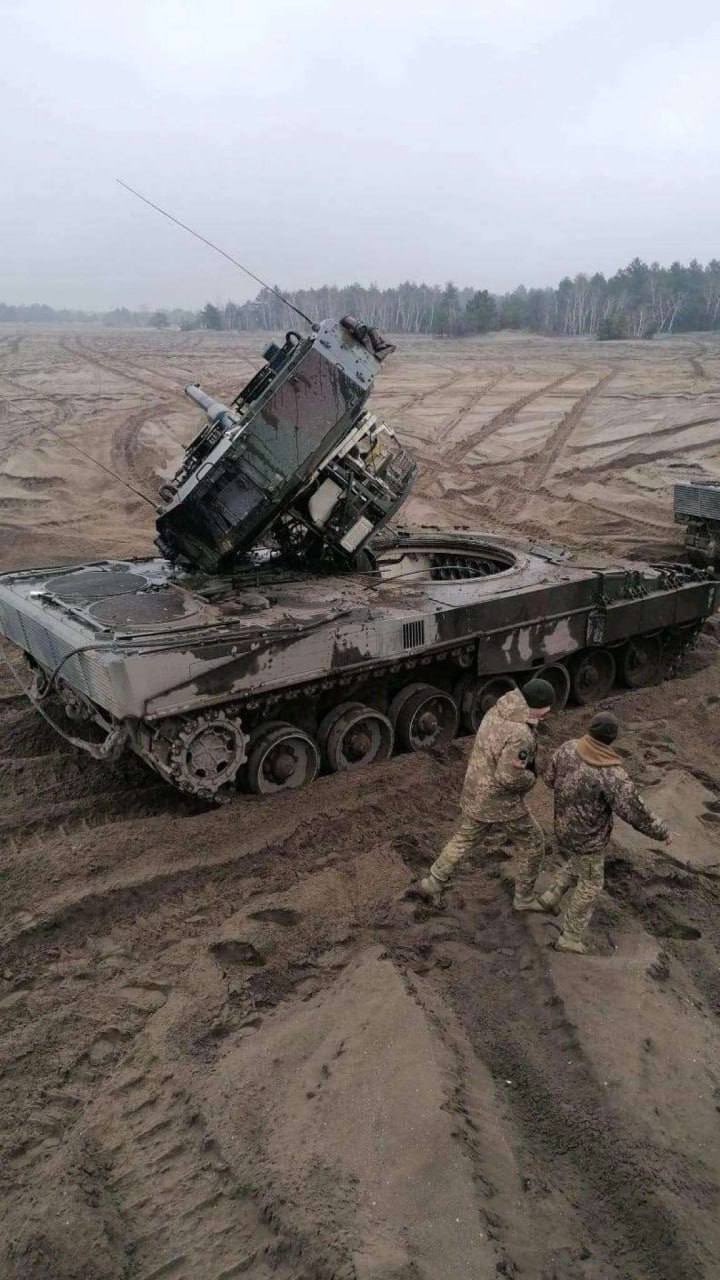 First Leopard 2 casualty of the Ukraine war, in Poland during training, as a result of one tank backing into the top of another :