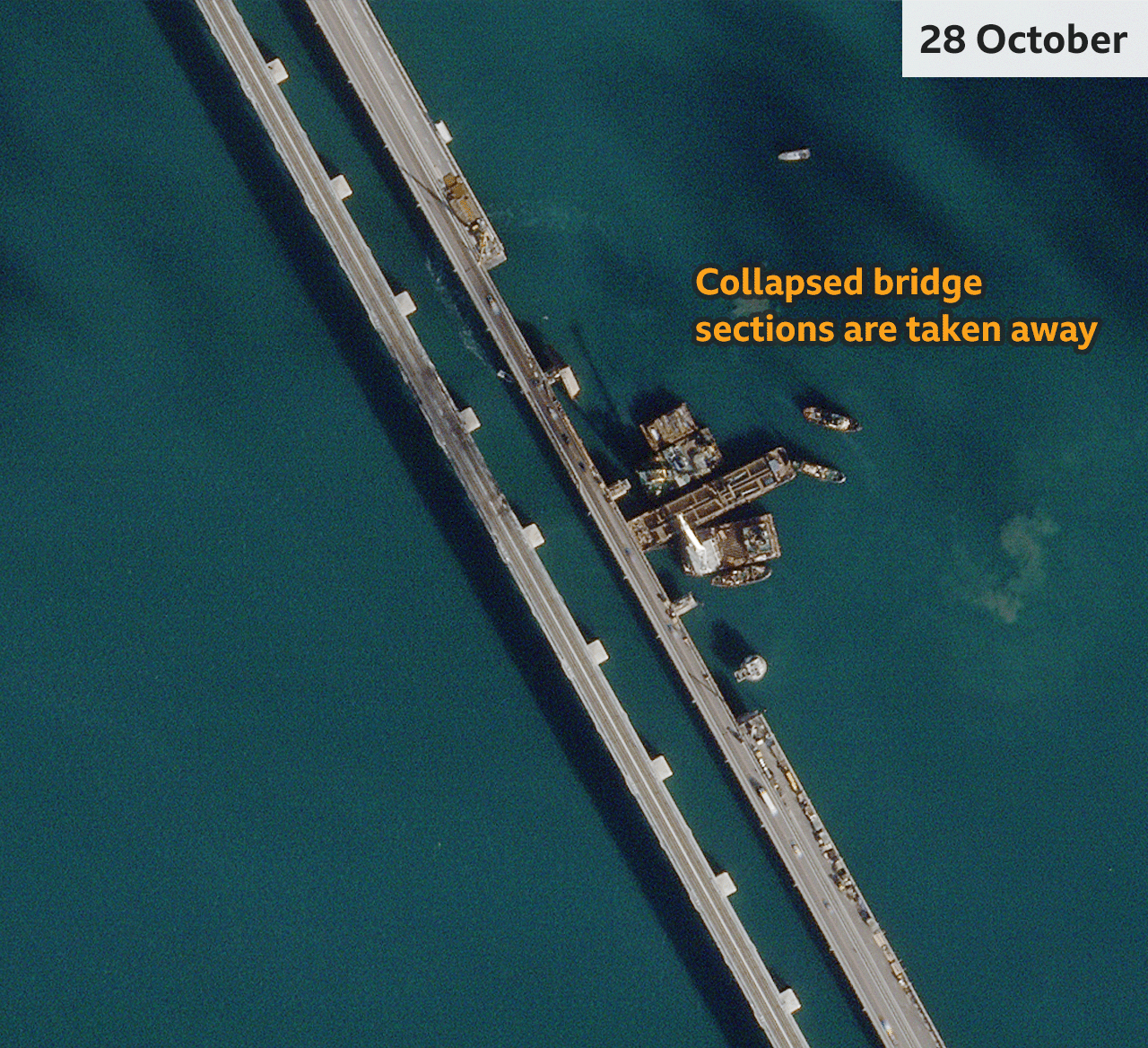 -On the Kerch Bridge: it was made open for traffic after one week the bombing, and not one day after, my bad. July is the final date of repair, but the bridge was open to traffic in both directions over the side of the span that only got minor damage, as shown in the slide show on the BBC article you've linked above.