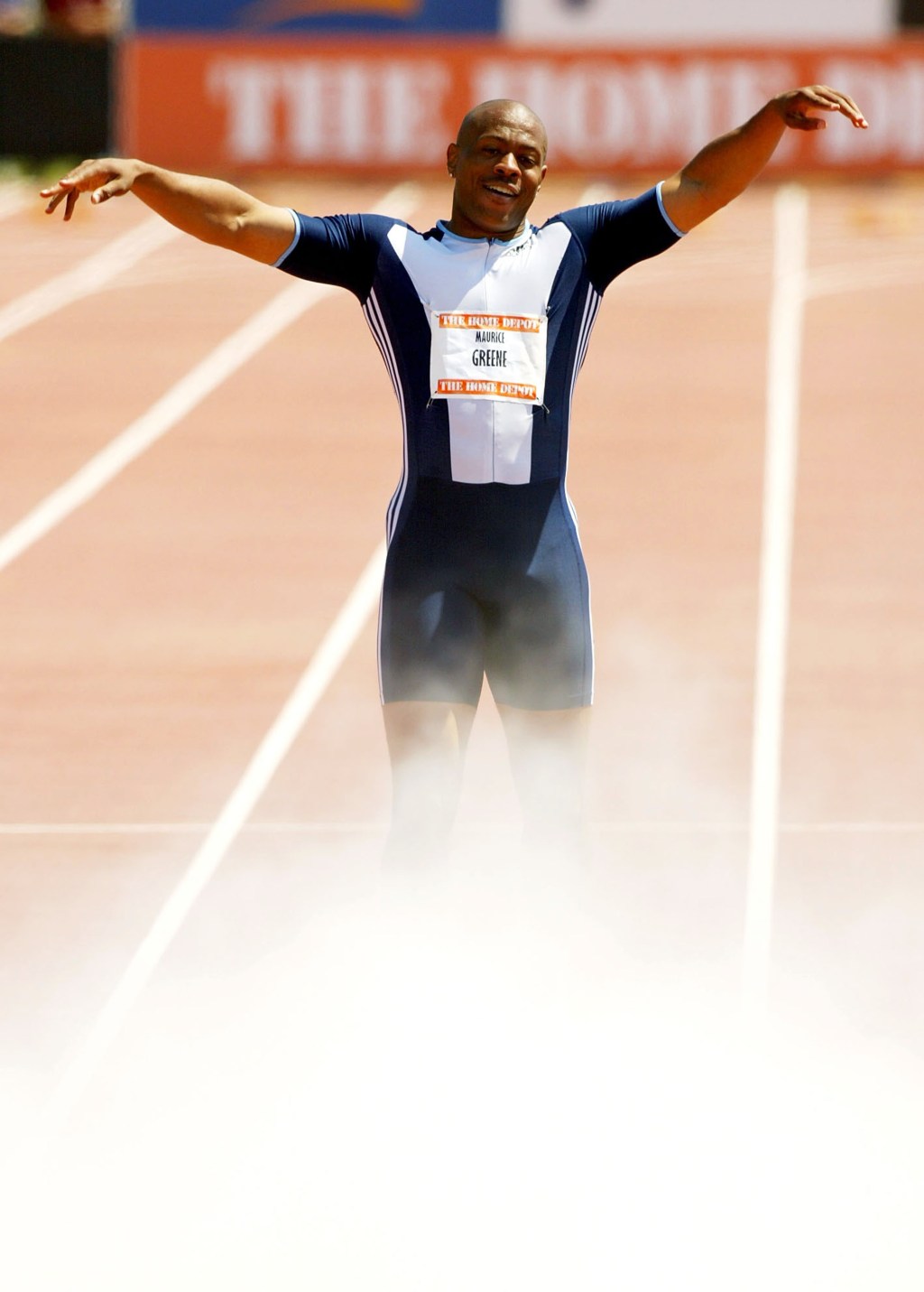 As some of you track fans may recall, Maurice Greene did the same thing (but in the middle of the track) after winning a 100m race. He threw off his shoes and his coach ran over to spray them with a fire extinguisher.