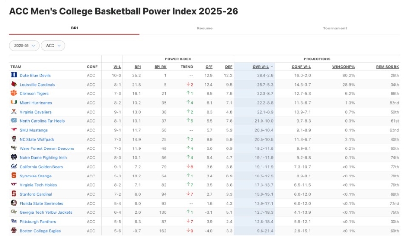 As it stands now, ESPN projects us to finish with a 19-12 record, and a 9th place finish in the ACC. See the attached chart below: